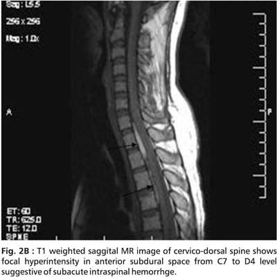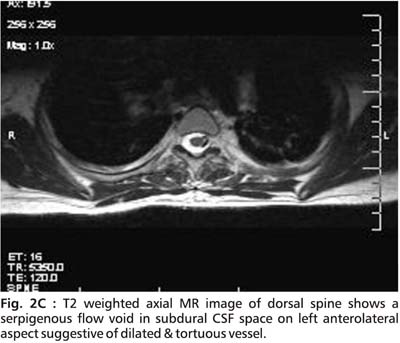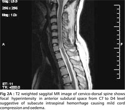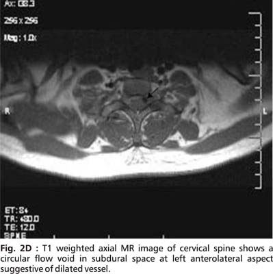 The cervical MR findings are suggestive of subacute spinal subdural hemorrhage appearing hyperintense on both T1 and T2 images. Serpigenous flow voids were seen on axial sections suggestive of Arterio-Venous malformation (AVM). Unfortunately, a subsequent angiographic study could not be done.